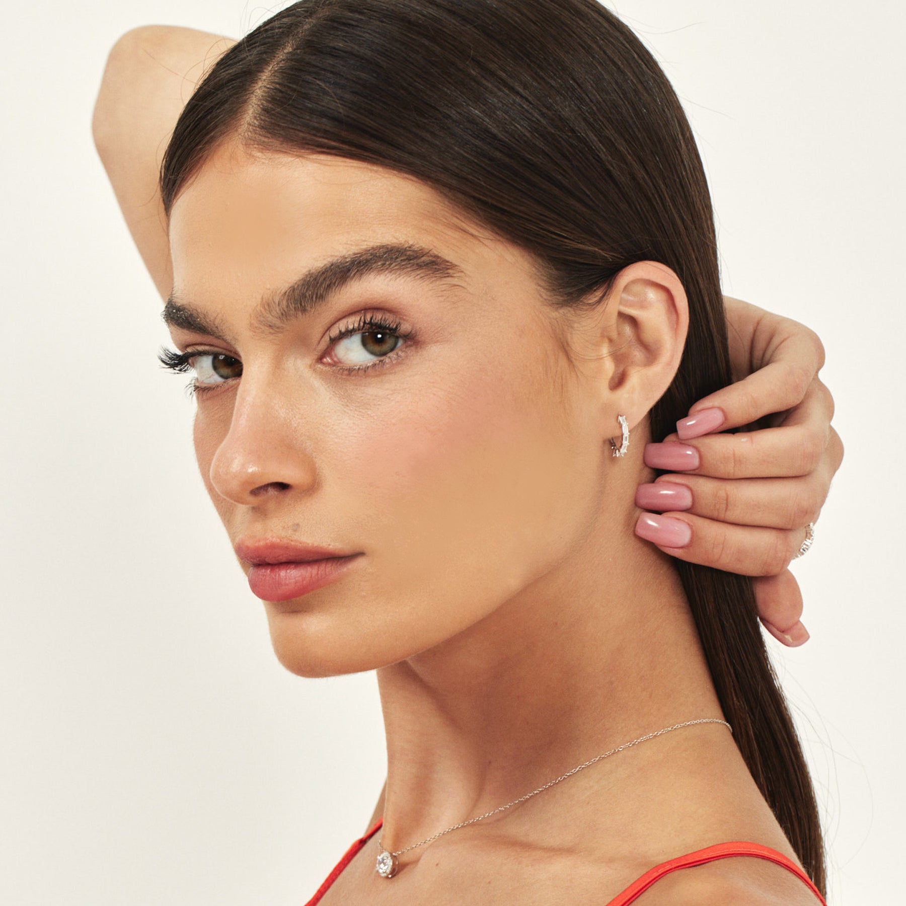 עגילי חישוק קטנטנים, עשויים כסף 925 ומשובצים זירקונים בצורת "בגט". העגילים עשויים בעבודת יד והם מצופים זהב K14.