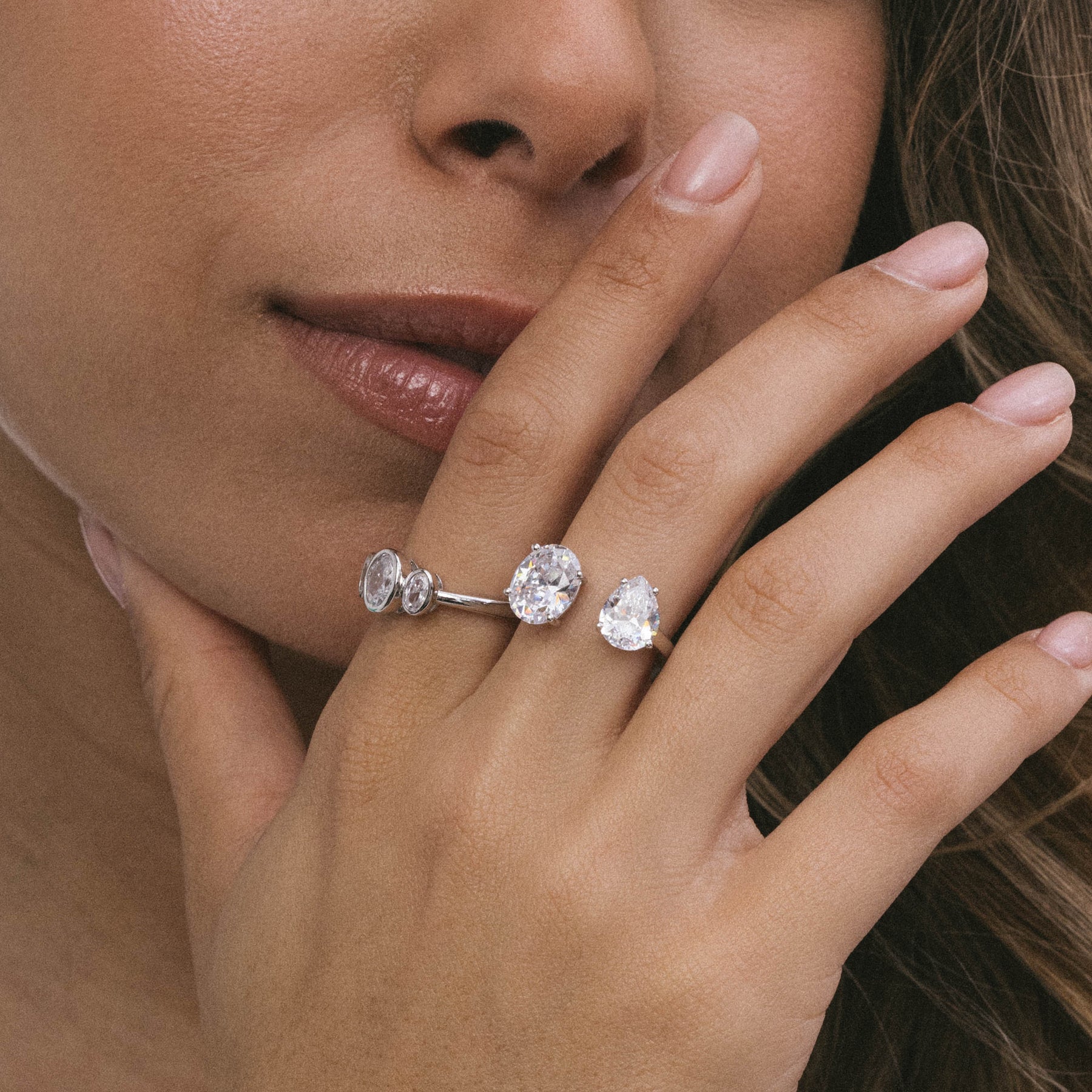 טבעת עדינה וטרנדית, עשויה שתי אבני זירקון יוקרתיות, שמעניקות לה נוכחות בולטת. הטבעת עשויה בעבודת יד והיא מצופה רודיום.