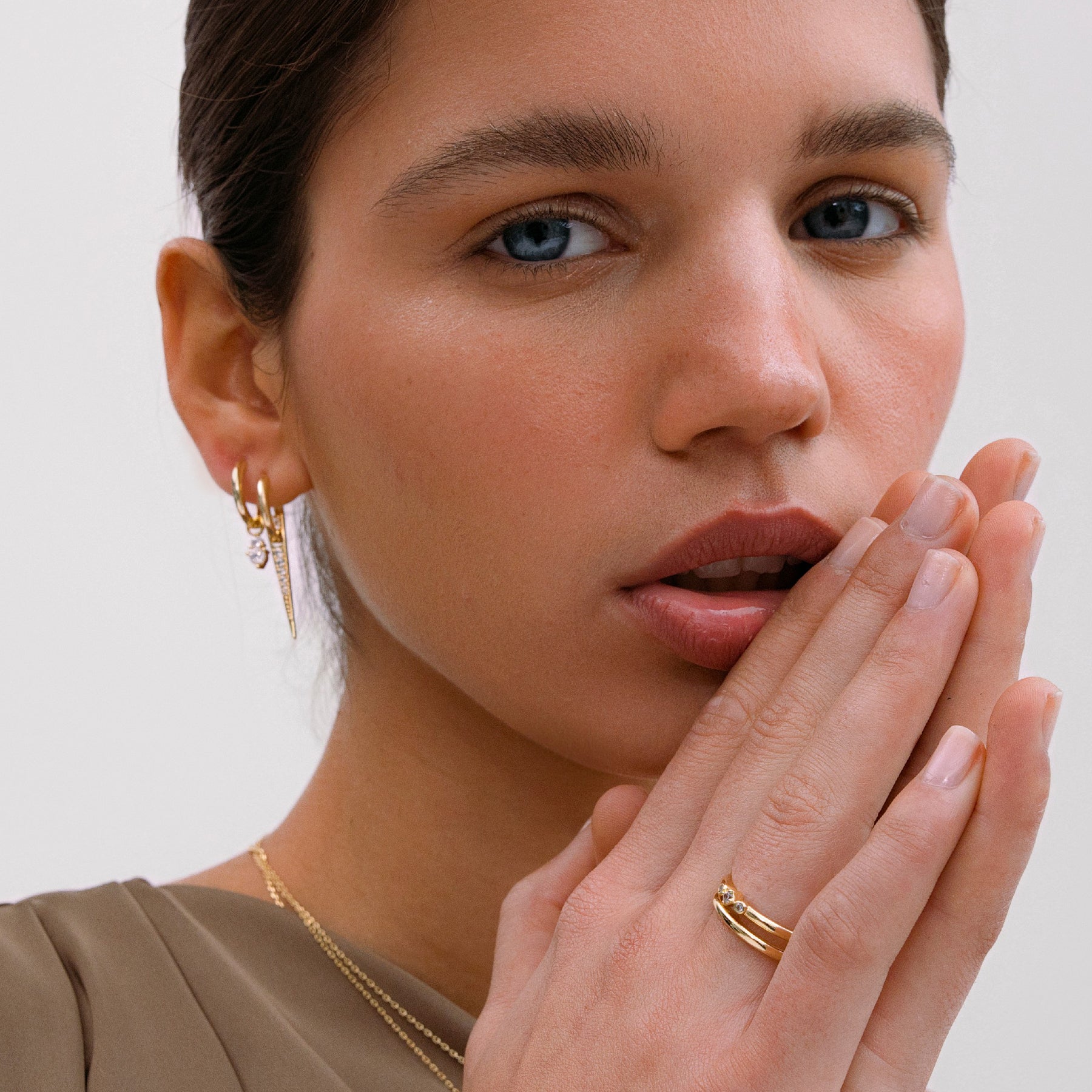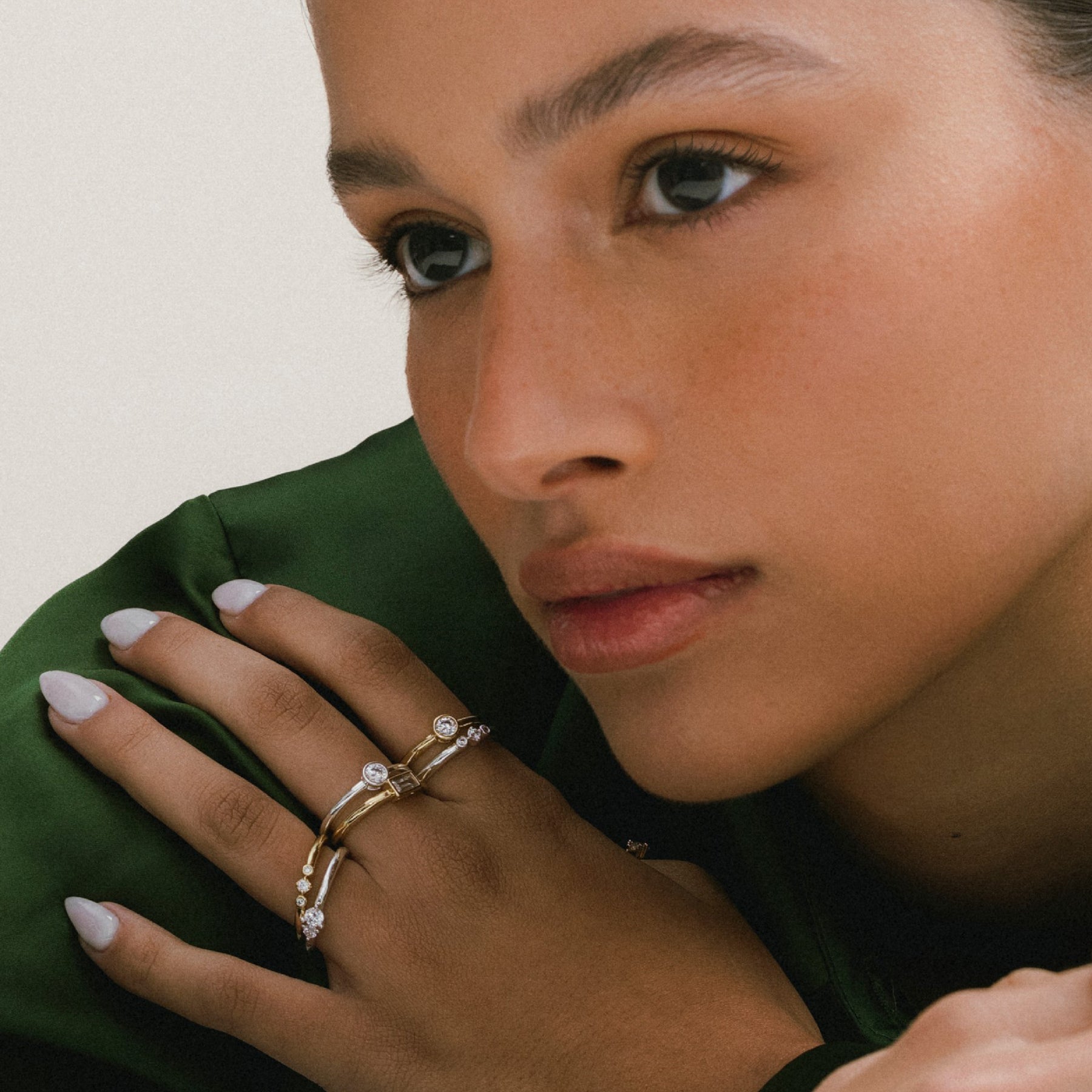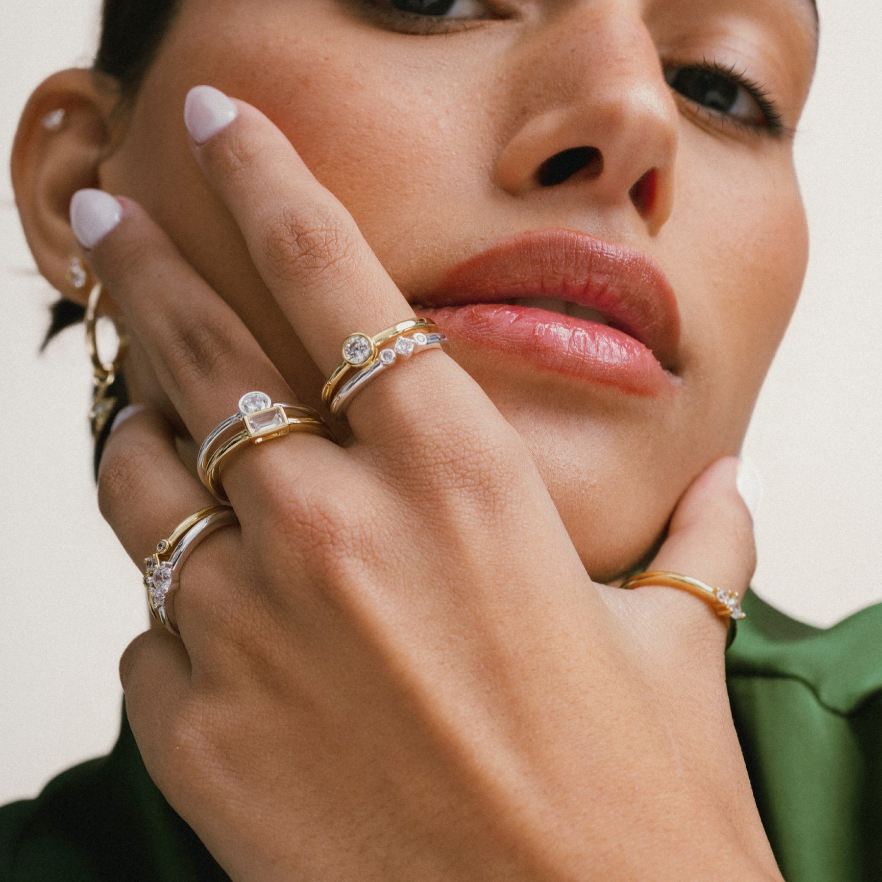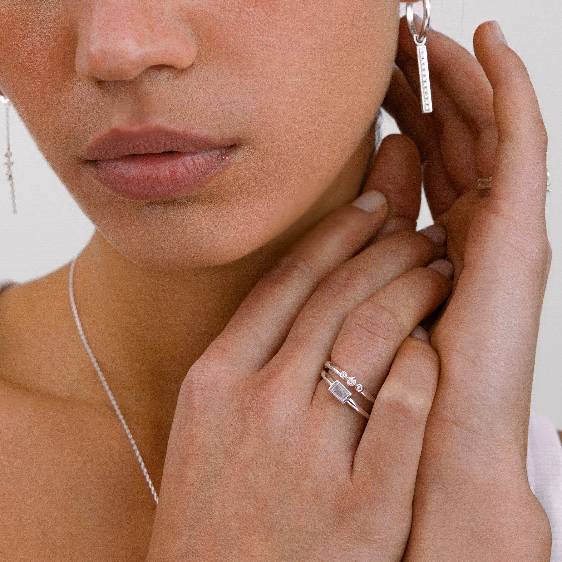 טבעת עדינה שבמרכזה שלוש אבני זירקון. הטבעת מעוצבת בישראל, מצופה כסף טהור ועשויה בעבודת יד אוהבת. הצמיד מהווה חלק מקולקציית Collect, שמציעה מגוון רחב של צ׳ארמס לעגילי חישוק, עגילים צמודים קטנים, שרשראות עדינות וצמידים דקיקים, אותם ניתן לשלב בדרכים שונות ליצירת מראה אישי וייחודי, שיביא לידי ביטוי את טעמך האישי, ישקף את מצב הרוח שלך וישלים באופן מדויק כל הופעה שתבחרי. התכשיטים בקולקציה נקראים בשמות אינואיטיים (אסקימוסים), כמו פתיתי שלג, שכל אחד מהם הוא ייחודי וחד-פעמי ביופיו.