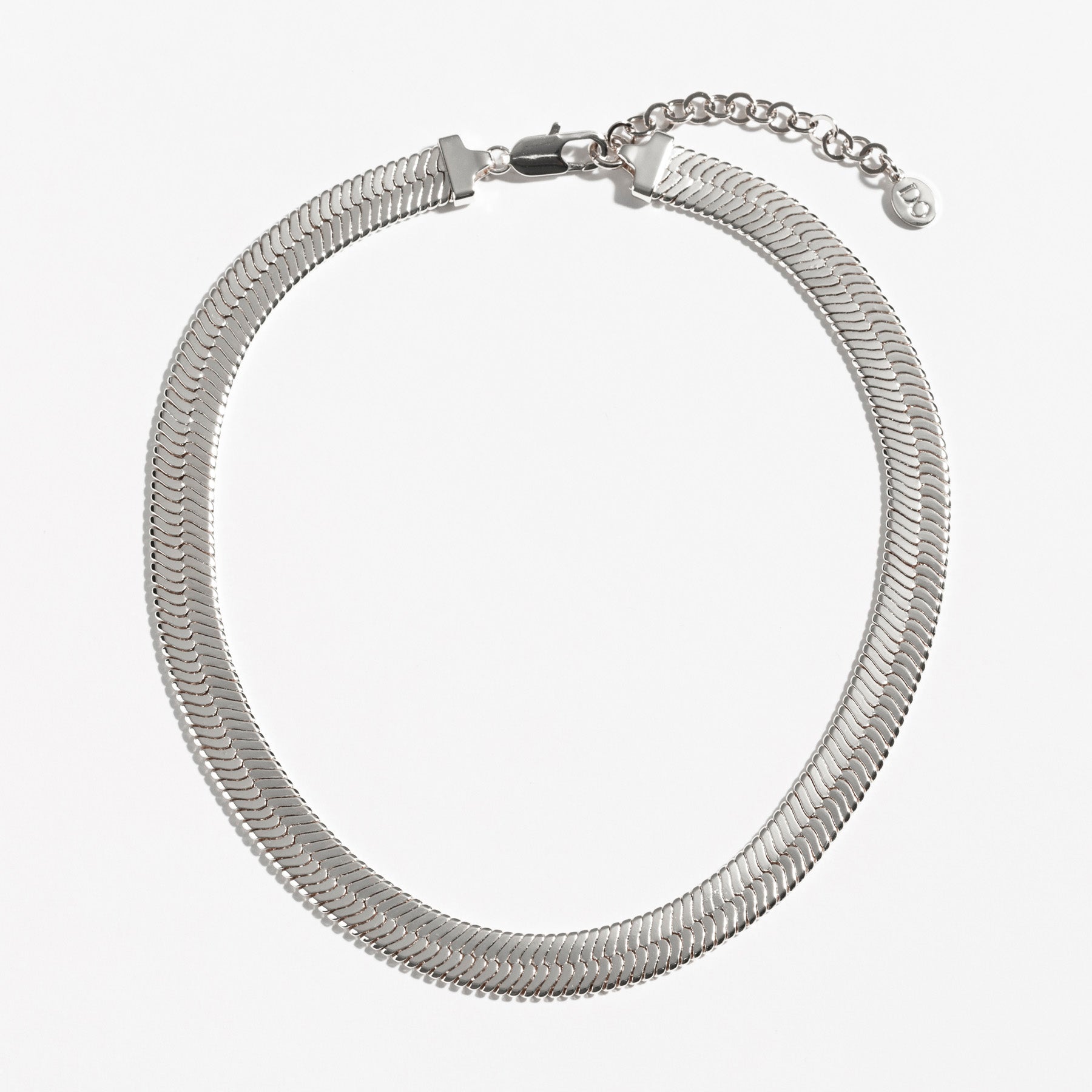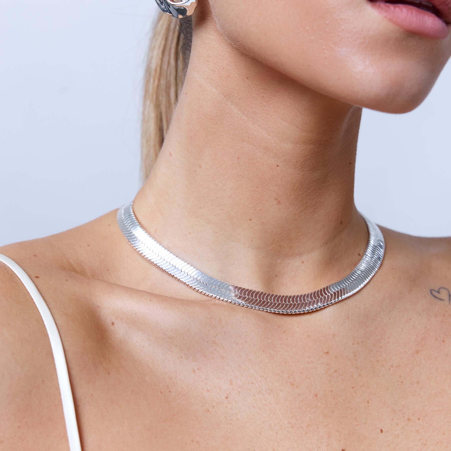 שרשרת שטוחה ורחבה בעיצוב אלגנטי, מרשים ועל-זמני, ללוק מלא נוכחות וסטייל. השרשרת עשויה בעבודת יד ומצופה בכסף טהור.