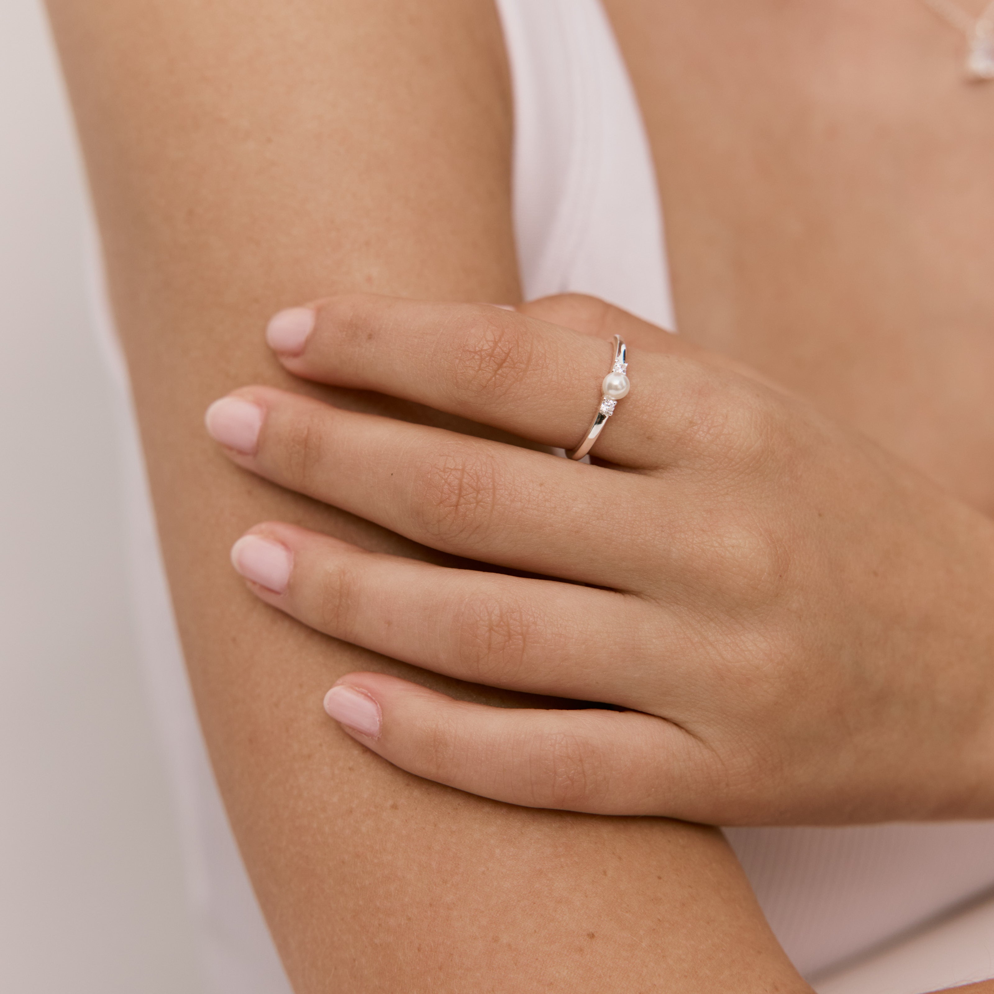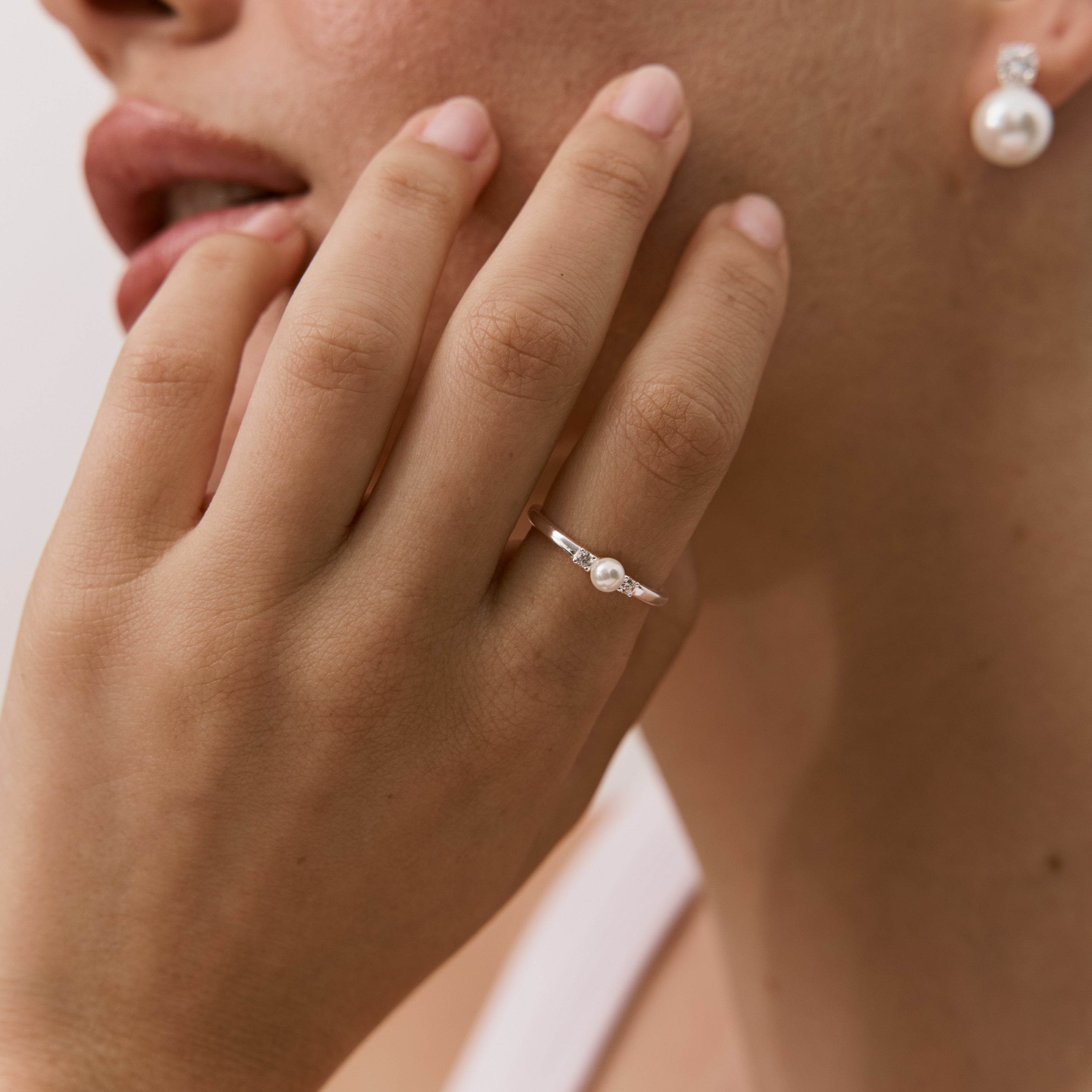 טבעת אלגנטית משובצת בפנינה וזירקונים, בעיצוב קלאסי על-זמני. הטבעת עשויה בעבודת יד מכסף סטרלינג 925 ומצופה בכסף טהור.