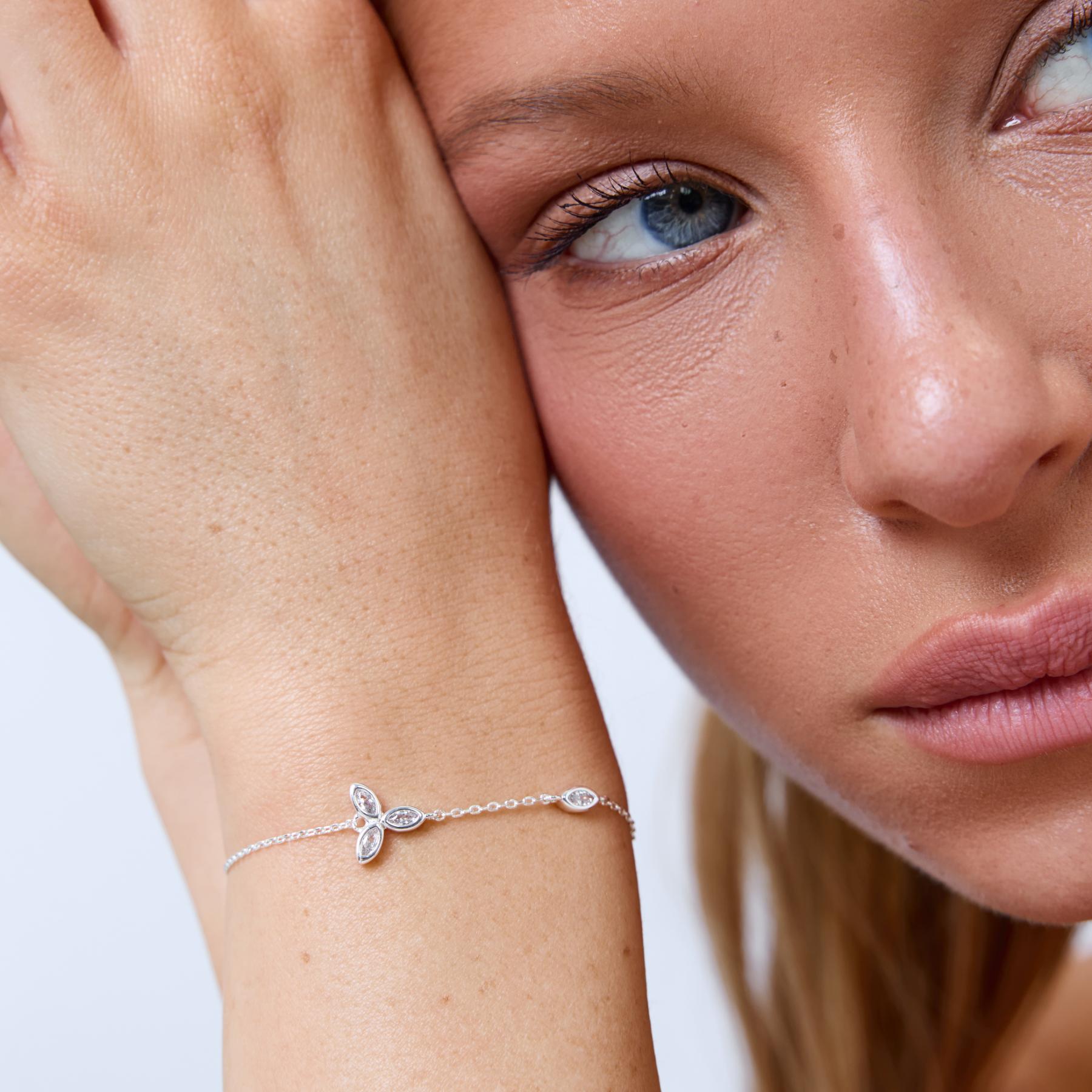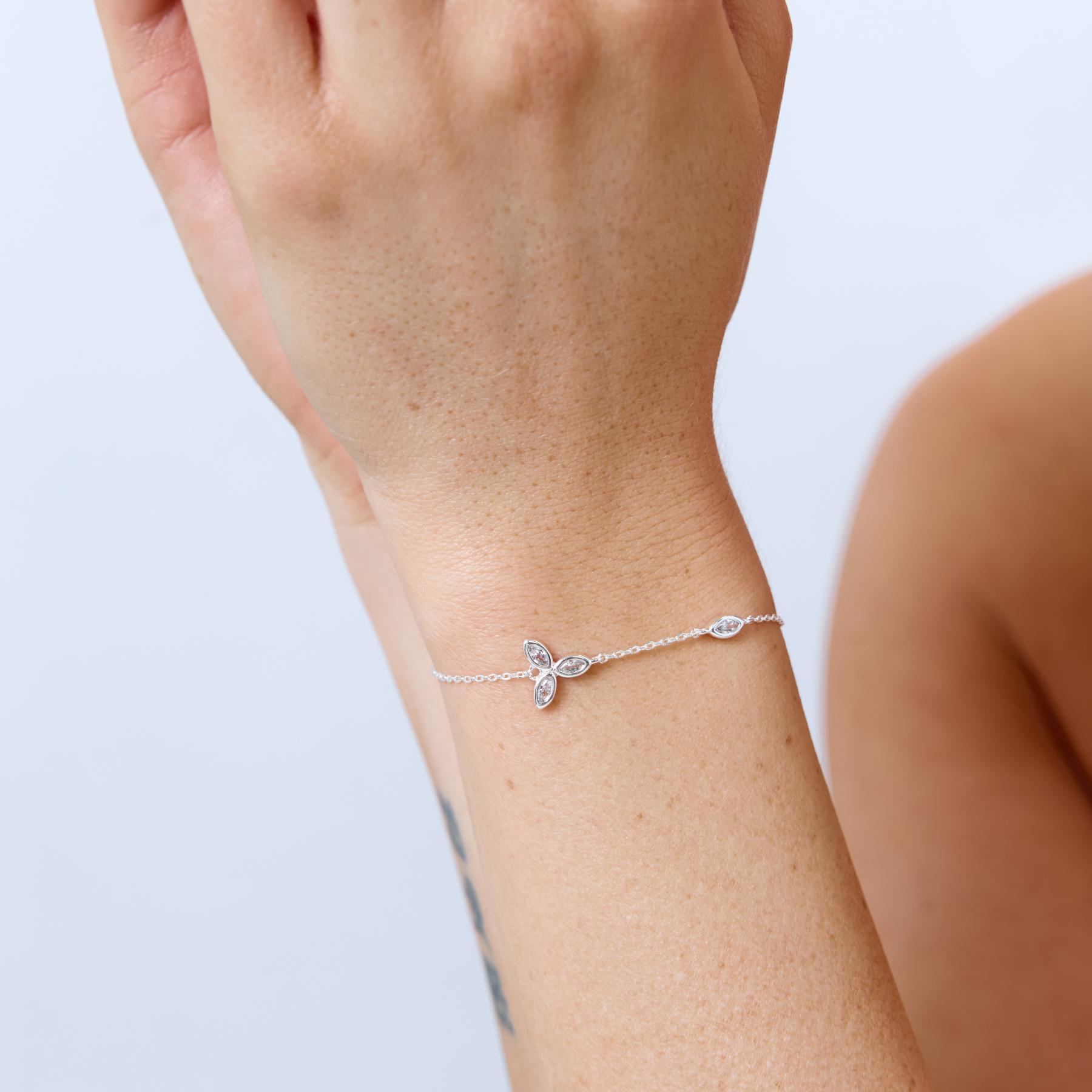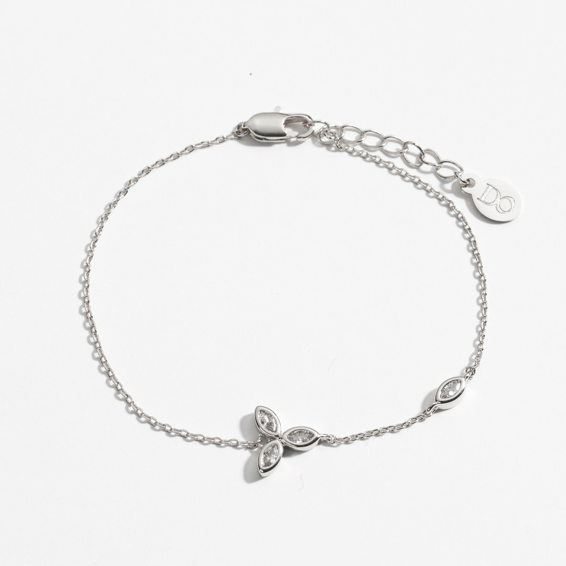 צמיד משובץ בזירקונים בצורת מרקיזה היוצרים יחד פרח עדין. הצמיד עשוי בעבודת יד ומצופה בכסף טהור.
