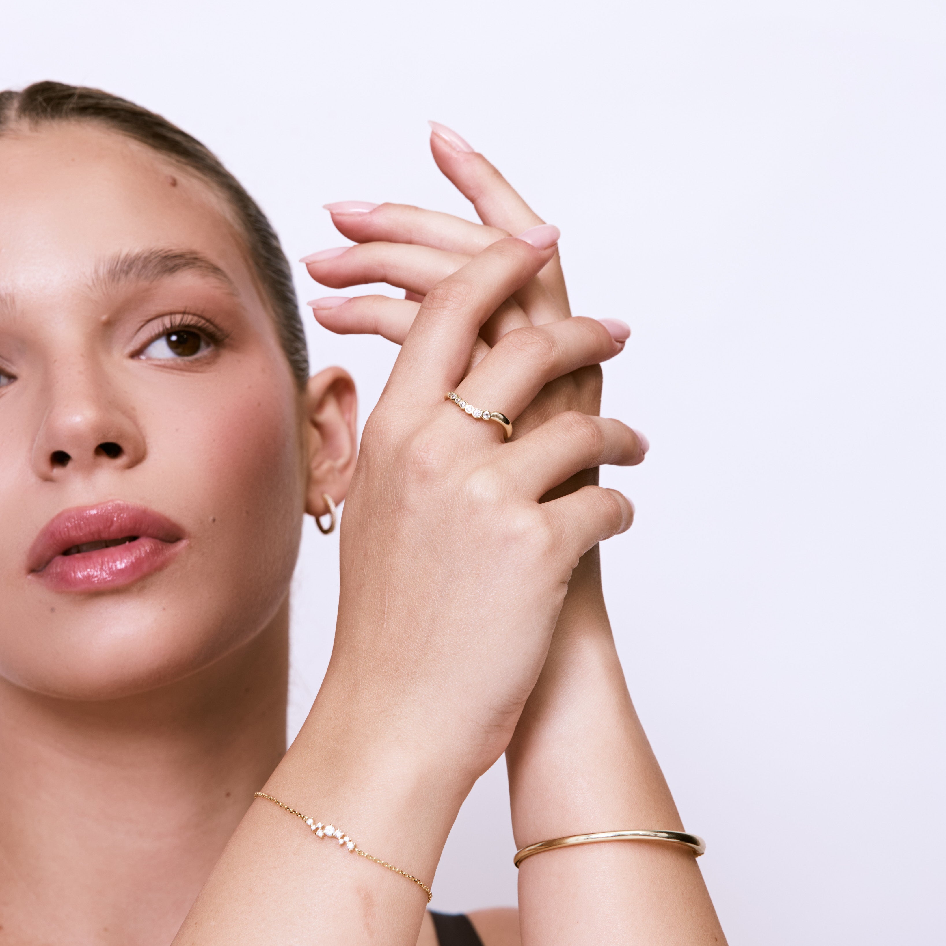 טבעת מפותלת משובצת בזירקונים נוצצים, בעיצוב יוקרתי ומדויק. הטבעת עשויה בעבודת יד ומצופה בזהב 14K.