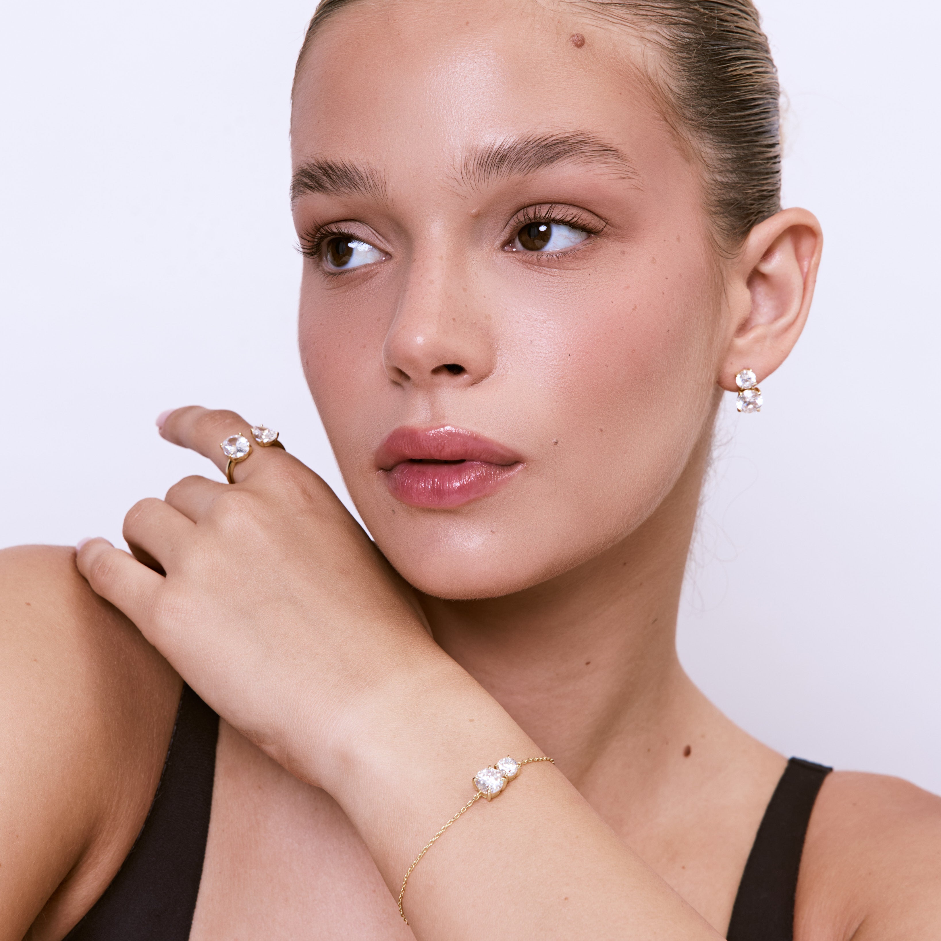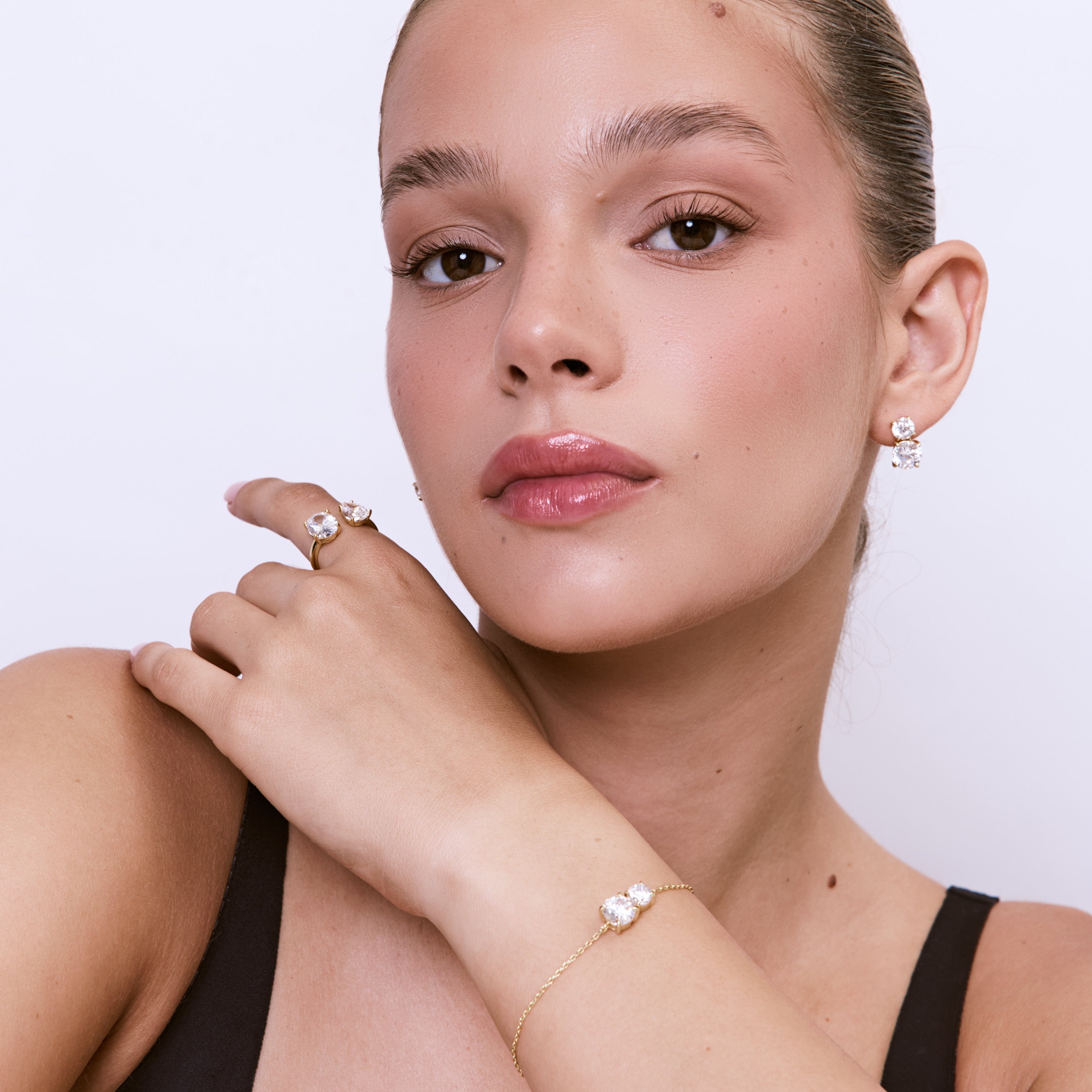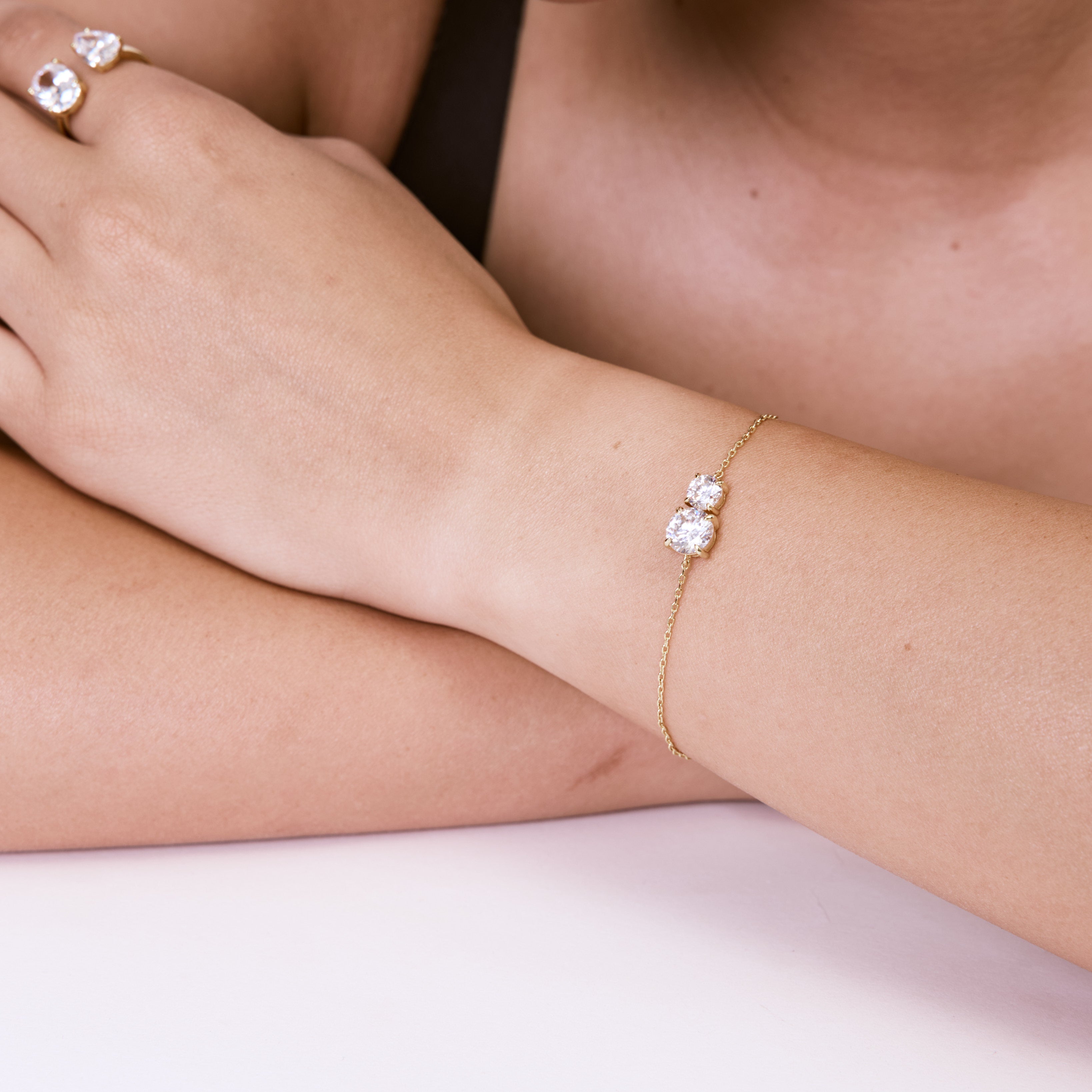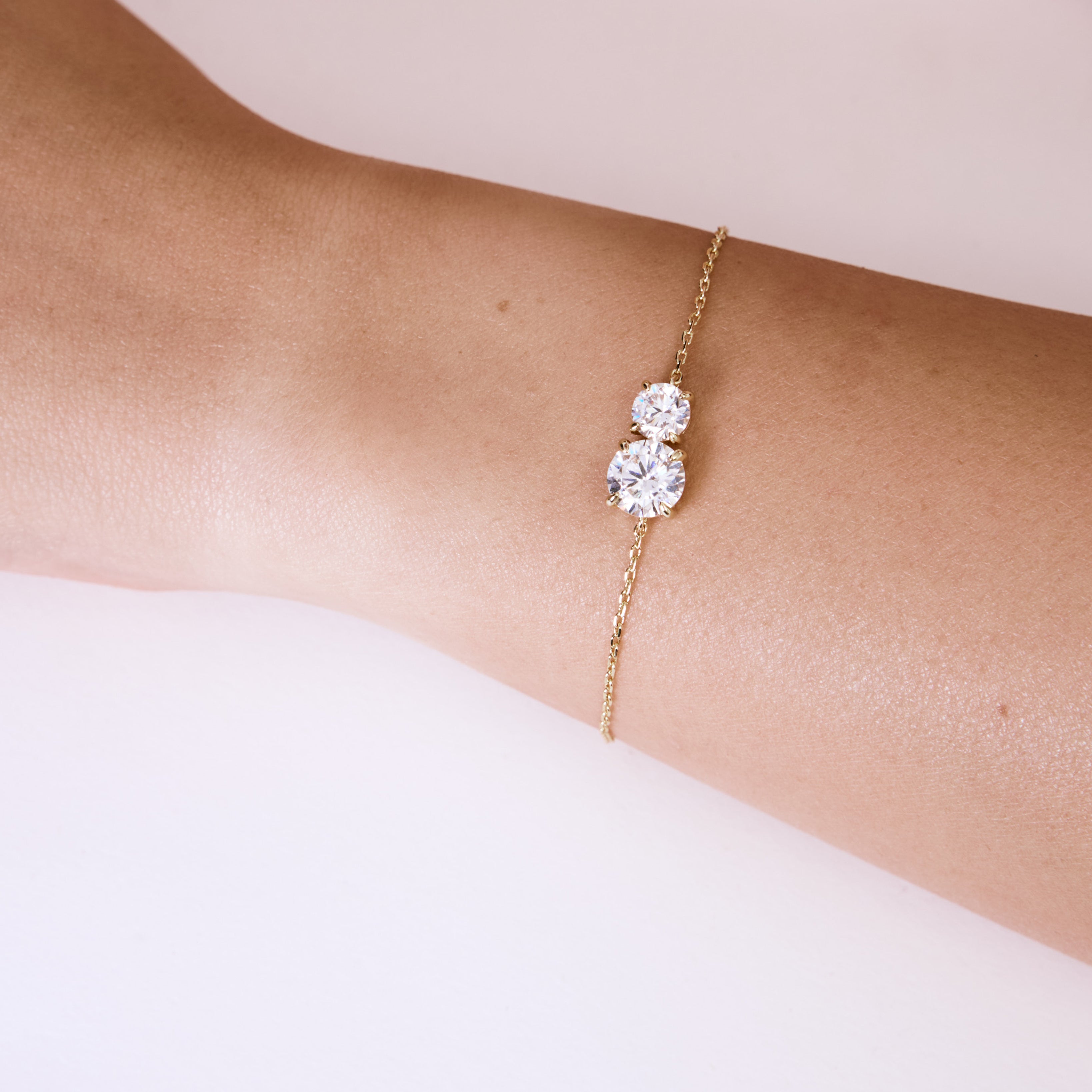 צמיד משובץ בזוג זירקונים, בעיצוב מדויק, יוקרתי ואלגנטי. הצמיד עשוי בעבודת יד ומצופה בזהב 14K.