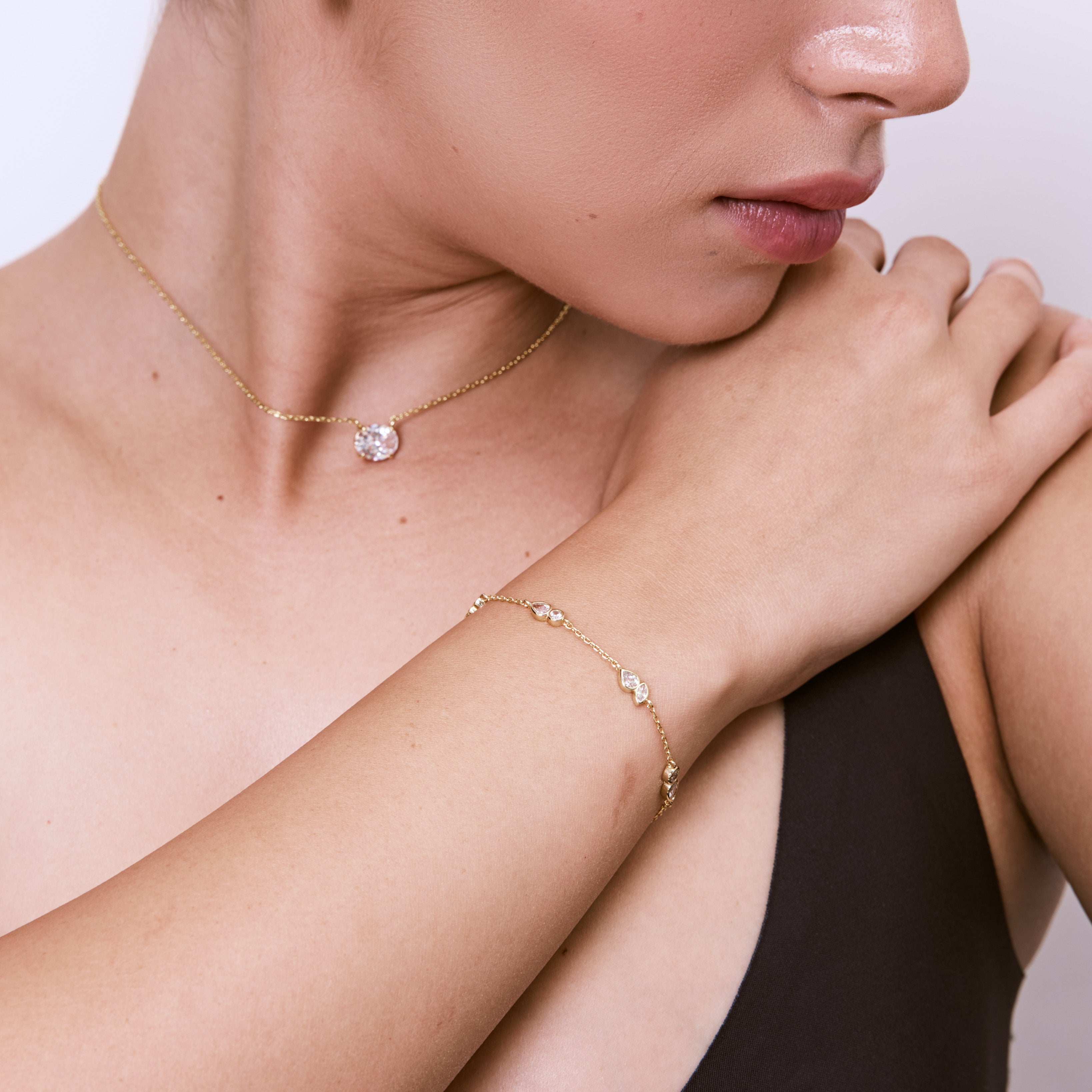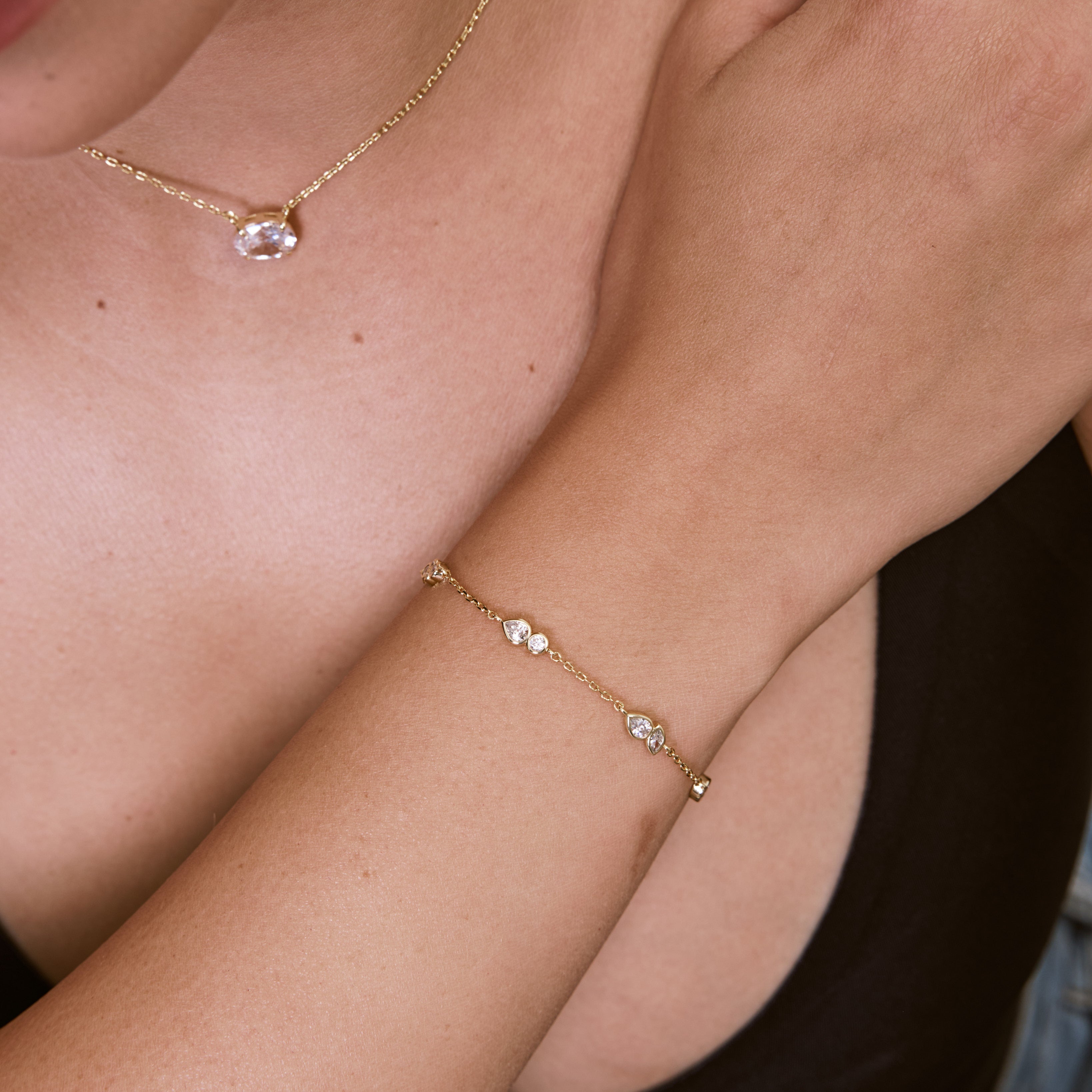 צמיד עדין משובץ בזירקונים במגוון צורות ושילובים, בעיצוב רענן, יוקרתי ומלא קסם. הצמיד עשוי בעבודת יד ומצופה בזהב 14K.