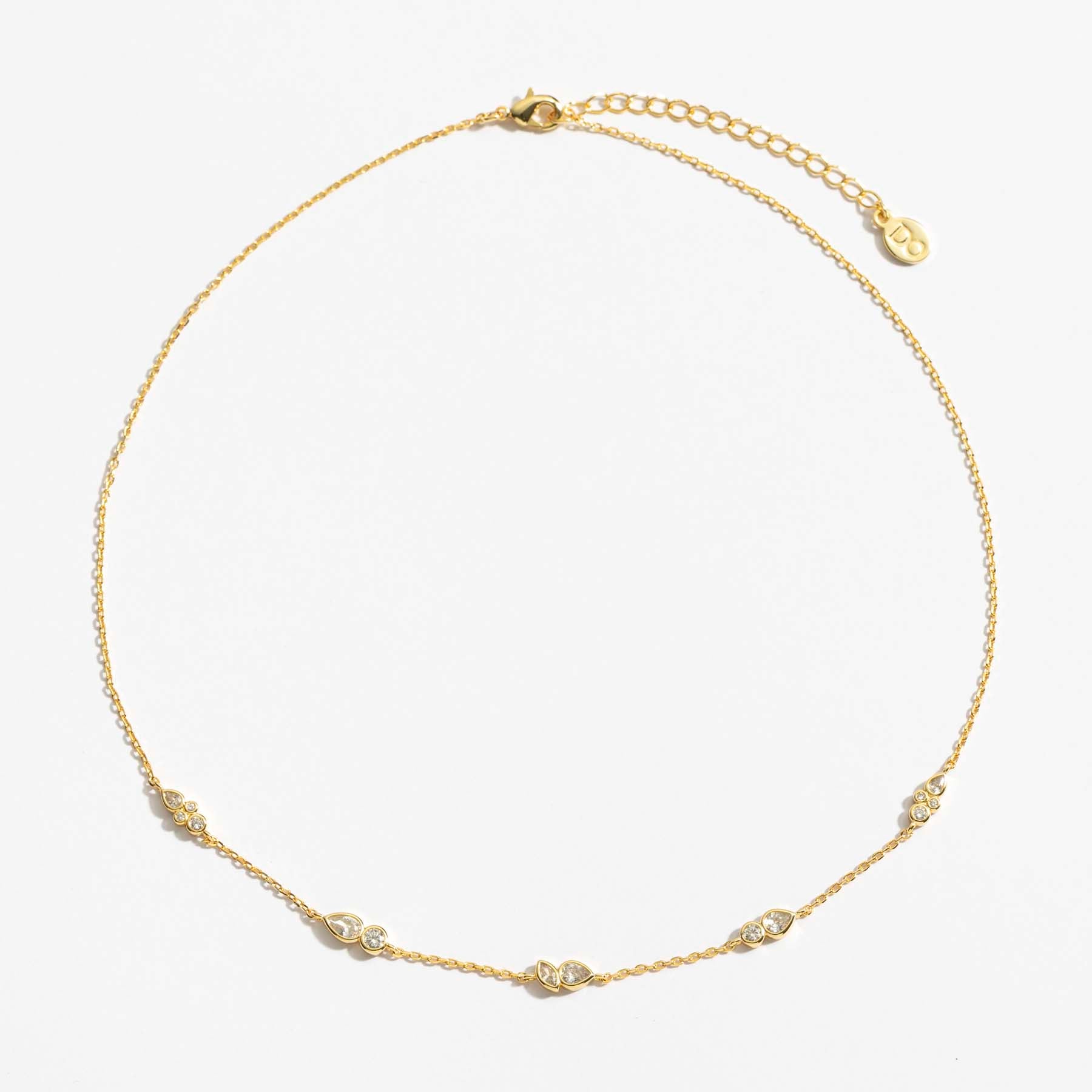 שרשרת עדינה משובצת בזירקונים במגוון צורות ושילובים, בעיצוב רענן, יוקרתי ומלא קסם. השרשרת עשויה בעבודת יד ומצופה בזהב 14K.