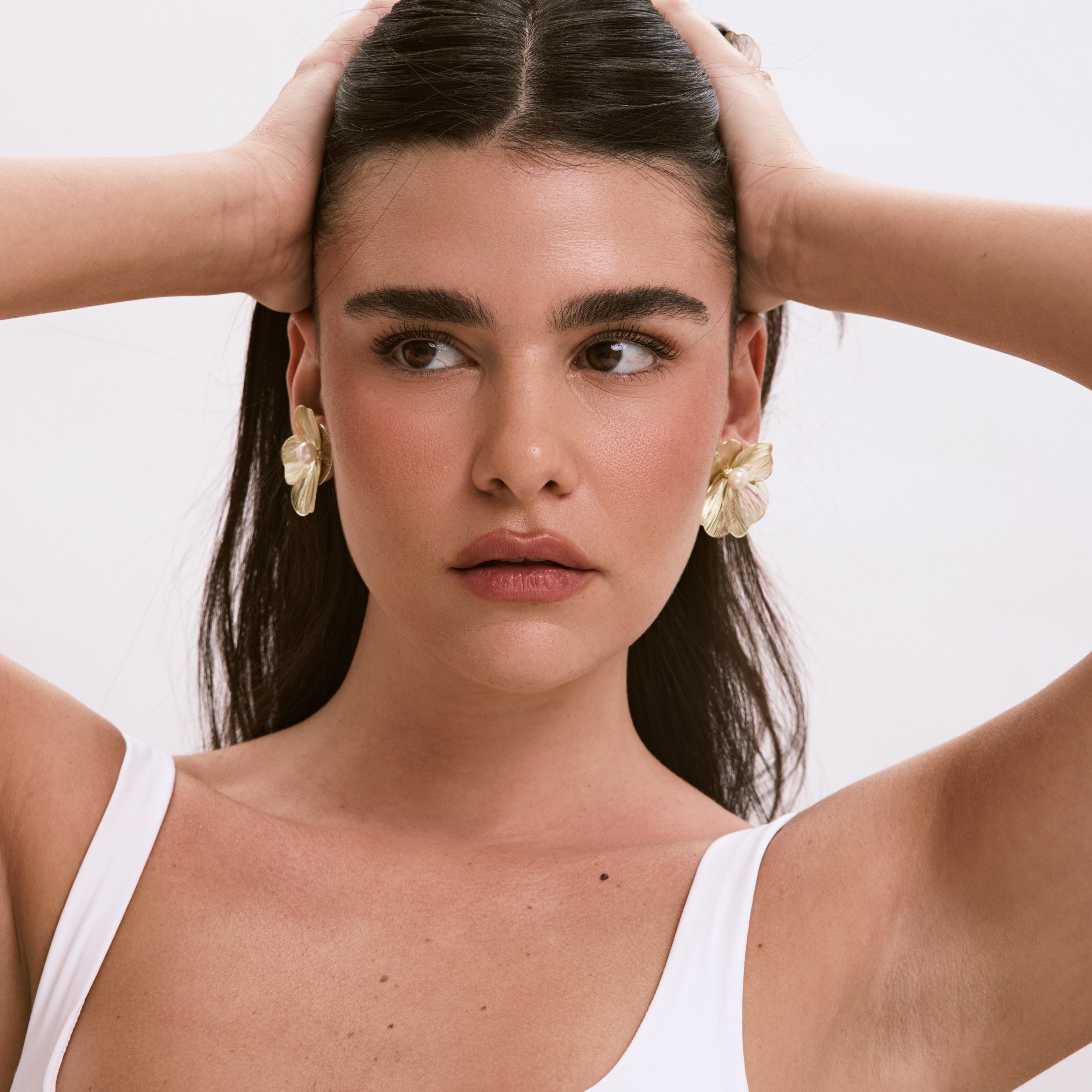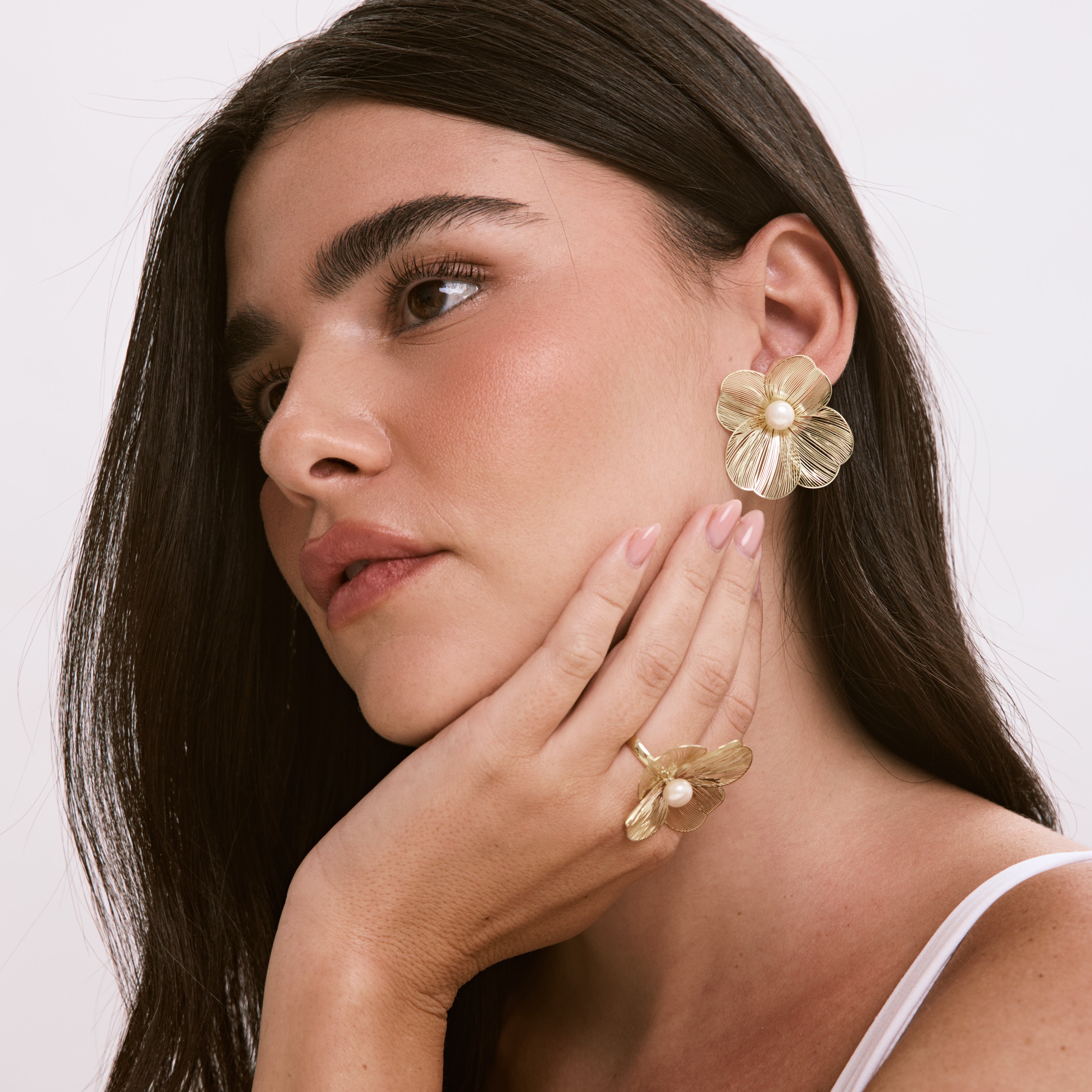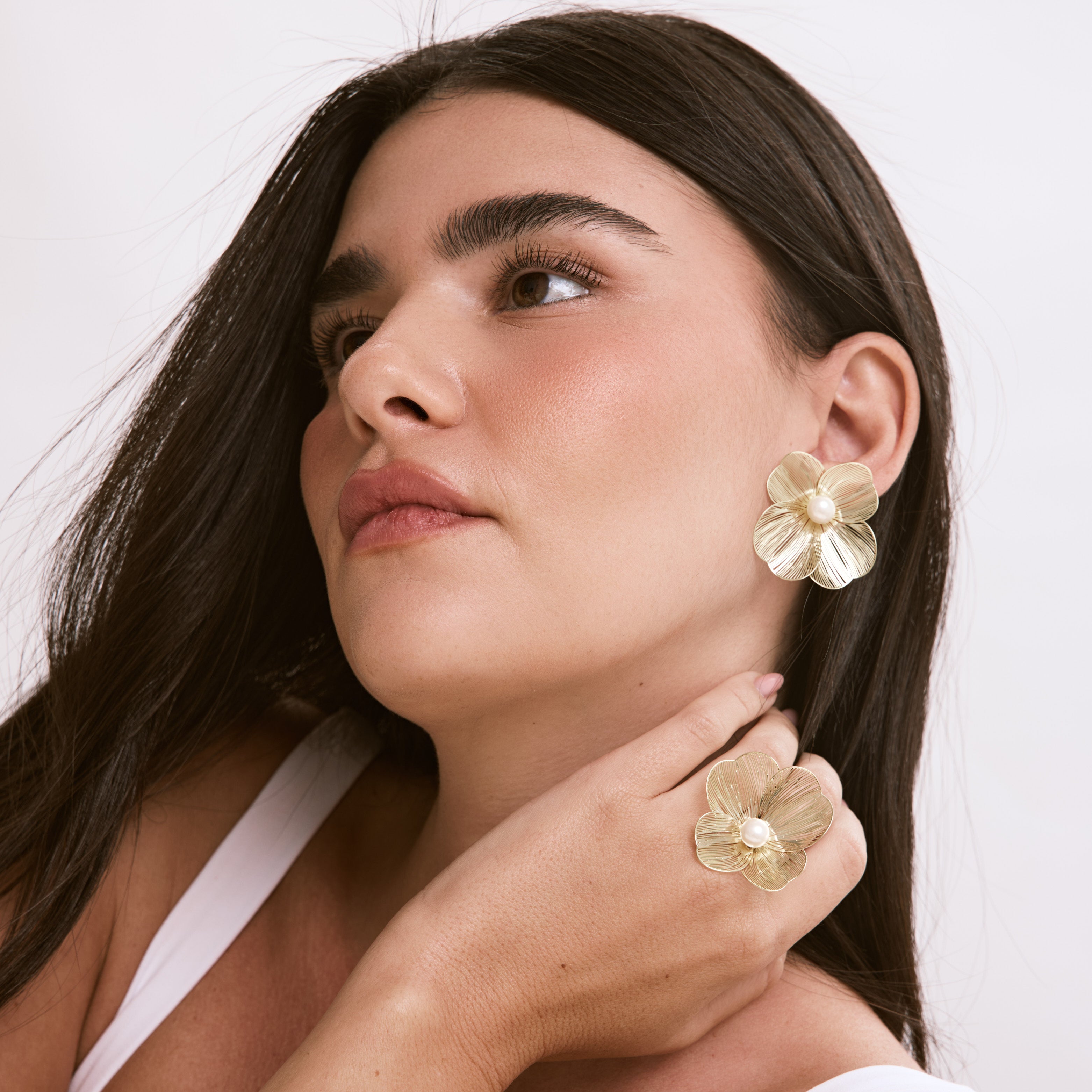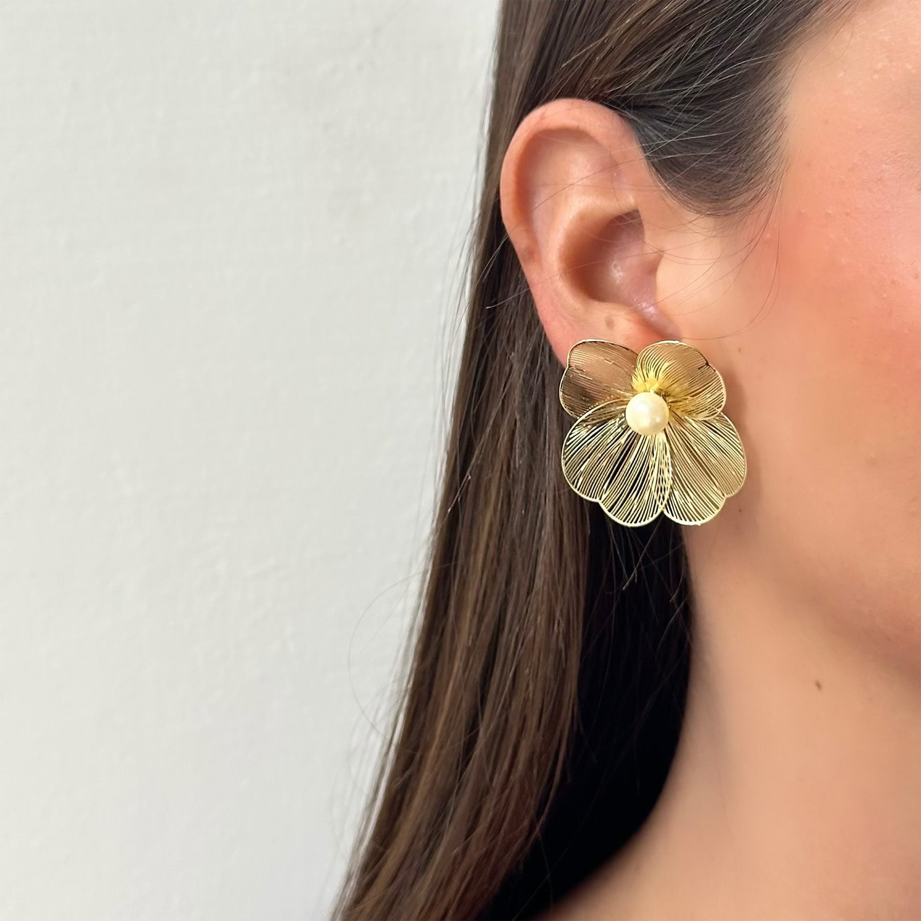 עגילי פרח גדולים ואווריריים עם פנינה, בעיצוב טרנדי ומלא סטייל שאי אפשר לפספס. העגילים עשויים בעבודת יד ומצופים בזהב 14K.