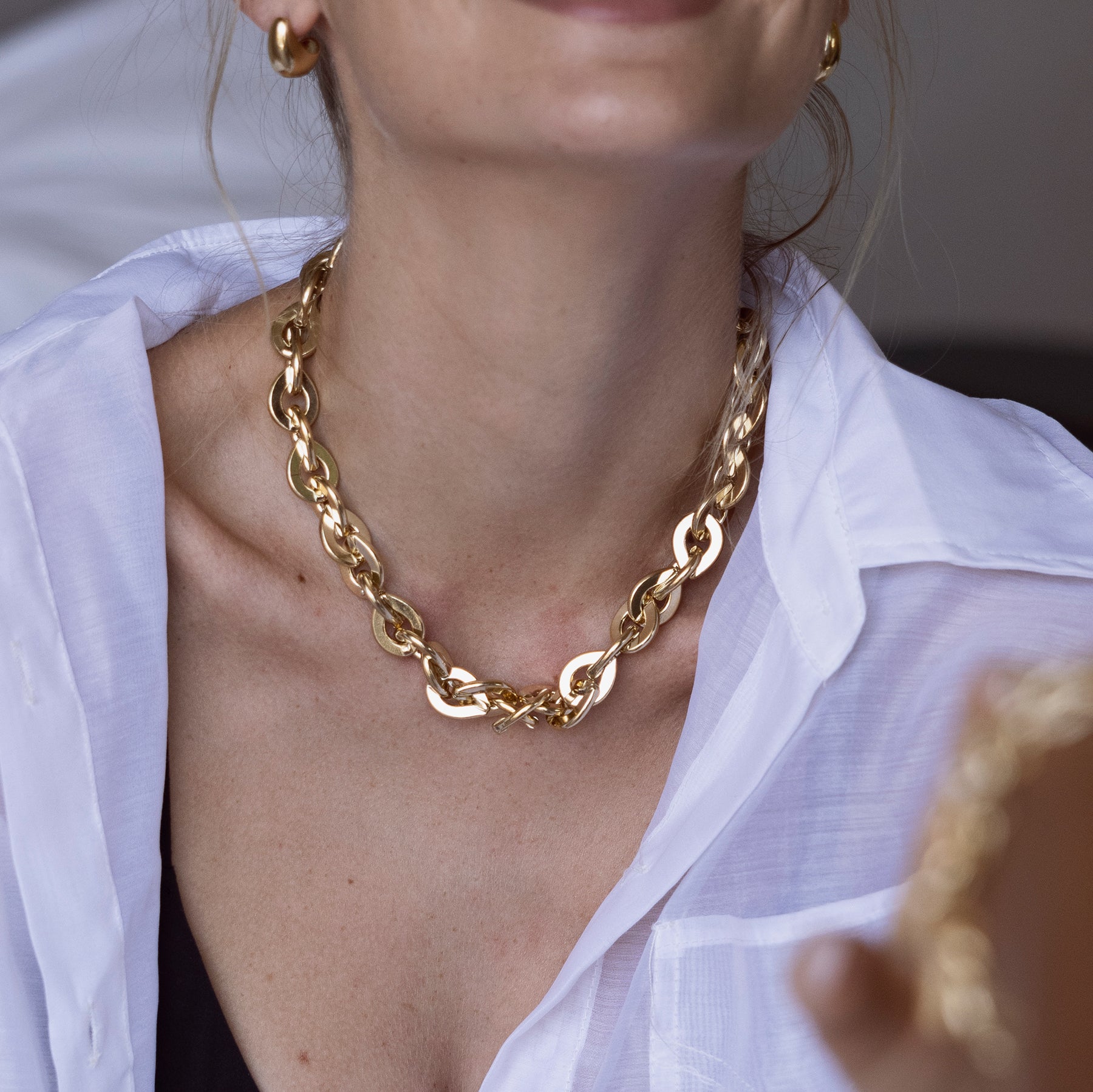 שרשרת חוליות גדולות, מצופה זהב 24K. שרשרת מרשימה במיוחד, בעלת נוכחות בולטת, כזאת שמושכת מיד את תשומת הלב ואי אפשר להתעלם ממנה.